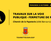 En raison de travaux réalisés par la commune du Bar-sur-Loup, la circulation sera totalement interdite sur le chemin de la Papeterie ce mercredi 8 octobre, de 8h00 à 17h00...