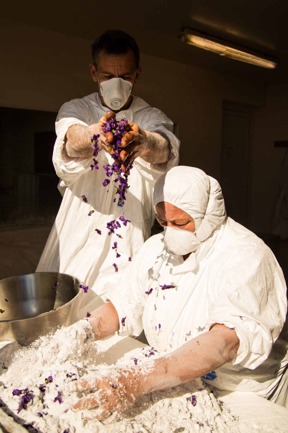 Chaque année, environ 500 kg de ces précieuses fleurs sont récoltés par la famille Coche pour être transformés en délicates violettes cristallisées.