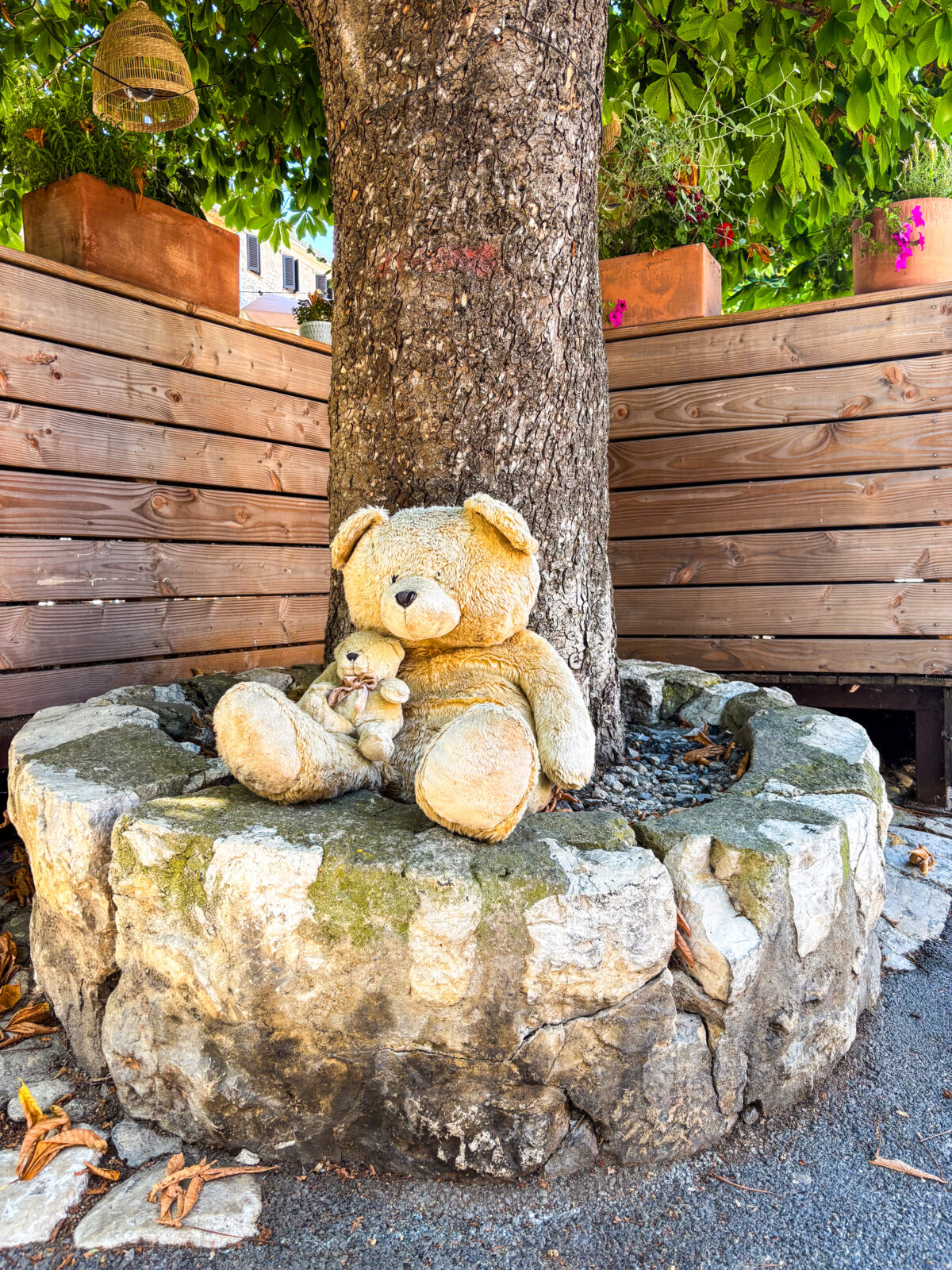 À l’ombre d’un arbre bienveillant, blotti contre le tronc comme pour trouver un peu de fraîcheur, un gros ours en peluche serre dans ses bras un ourson plus petit. Installés dans une jardinière, ces deux compagnons semblent veiller en silence sur les passants, offrant une parenthèse inattendue de douceur au cœur de l’espace public.