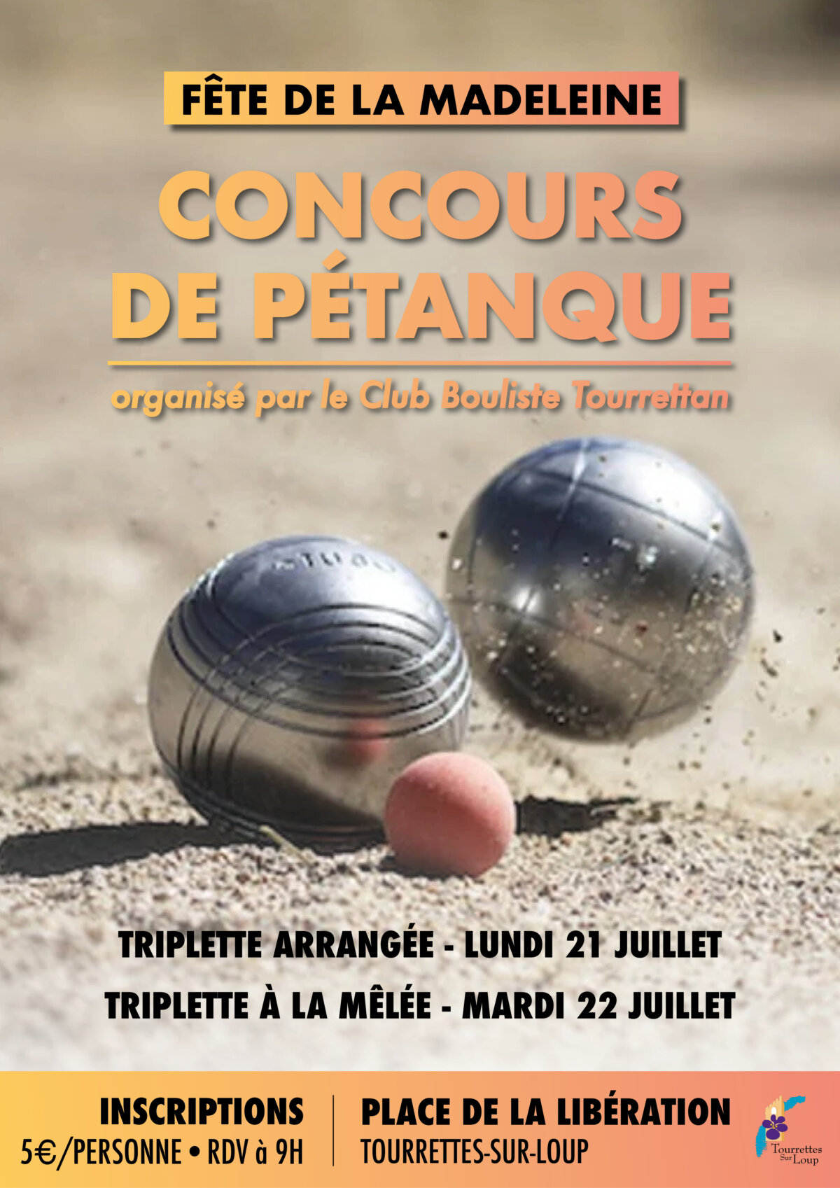 📆 Lundi 21 et mardi 22 juillet 📍 Place de la Libération - Tourrettes-sur-Loup 👉 Inscription sur place à 9h - 5 € par personne 🕘 Début des partie à 10h
