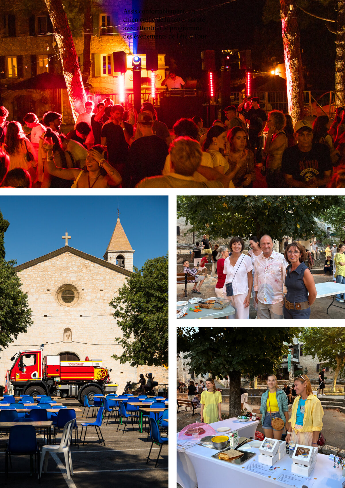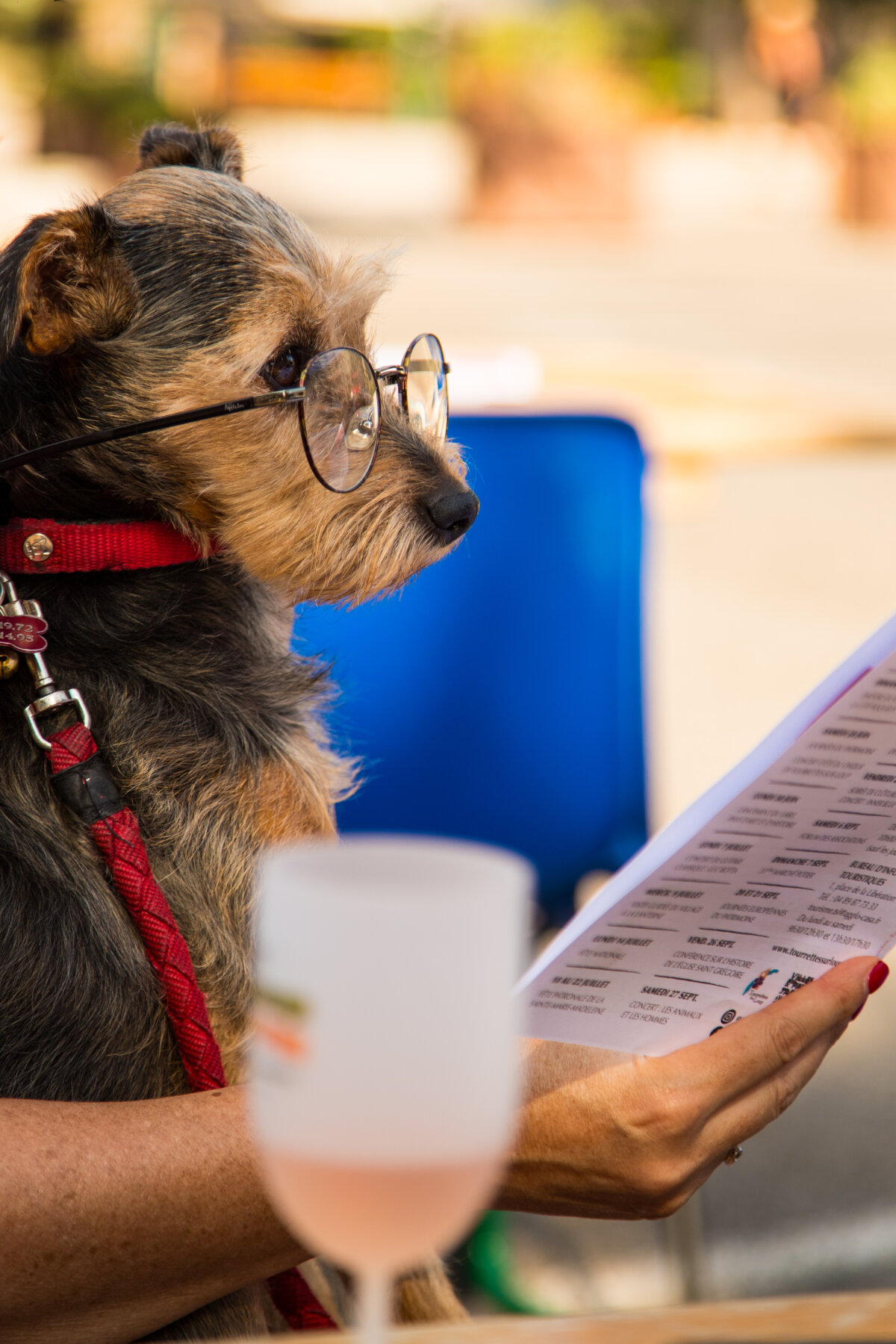 Assis confortablement, un chien coiffé de lunettes scrute avec attention le programme des événements de l'été à Tourrettes-sur-Loup. Concentré sur sa lecture, il semble prêt à profiter pleinement des animations et festivités qui rythmeront la saison, en particulier la fête de la Madeleine qui arrive ce week-end, moment fort et convivial à ne pas manquer dans notre village !