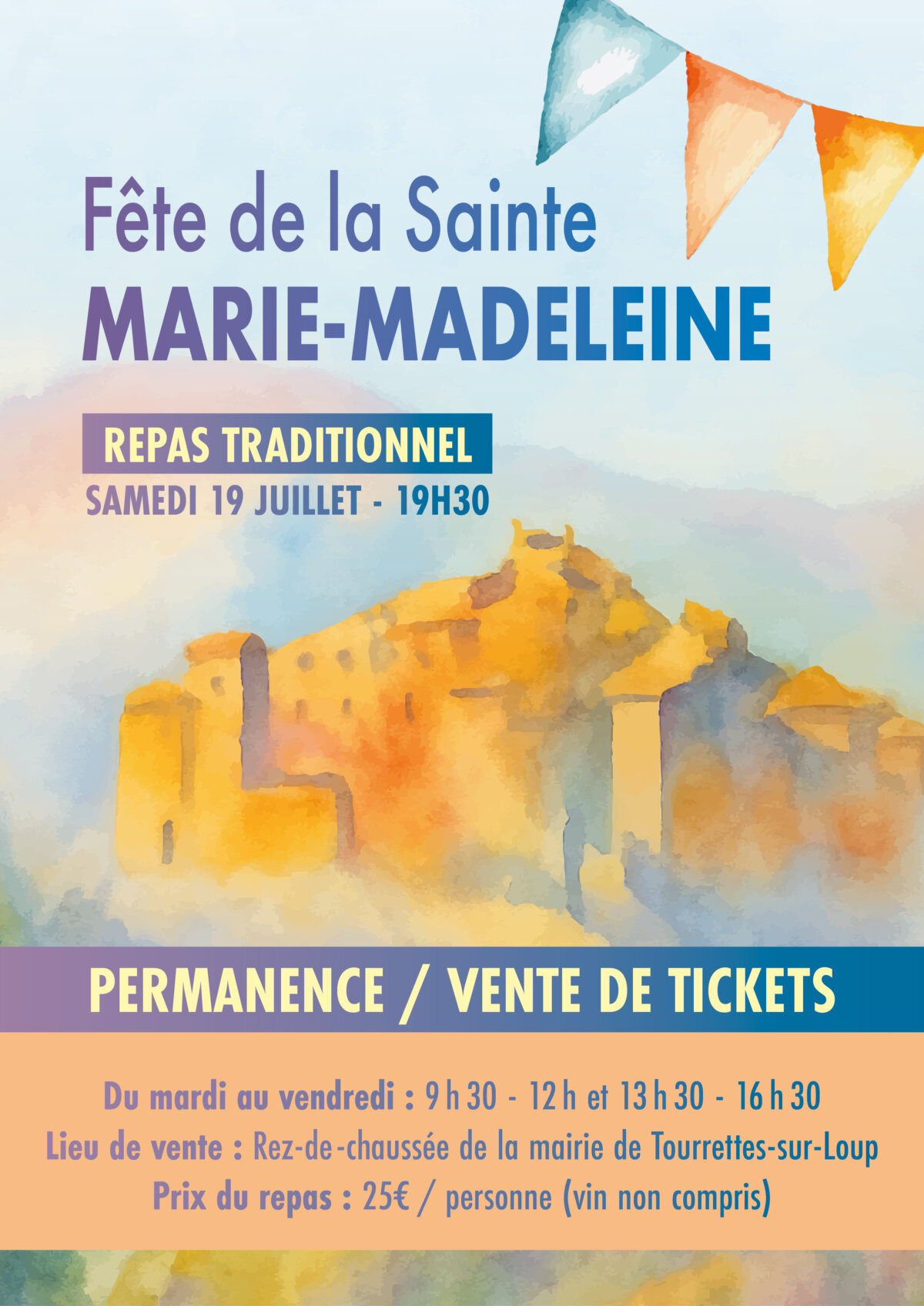 - Fête patronale de la Sainte-Marie-Madeleine - Fête de la Madeleine : conférence « Violette de Tourrettes et innovation : vers de nouveaux produits » - Fête de la Madeleine : Soirée DJ - Fête de la Madeleine : repas traditionnel - Fête de la Madeleine : Apéritif d'honneur - Fête de la Madeleine : Rosé dansant - Fête de la Madeleine : visite théâtralisée à la lanterne en Pays de Vence - Fête de la Madeleine : Concours de pétanque