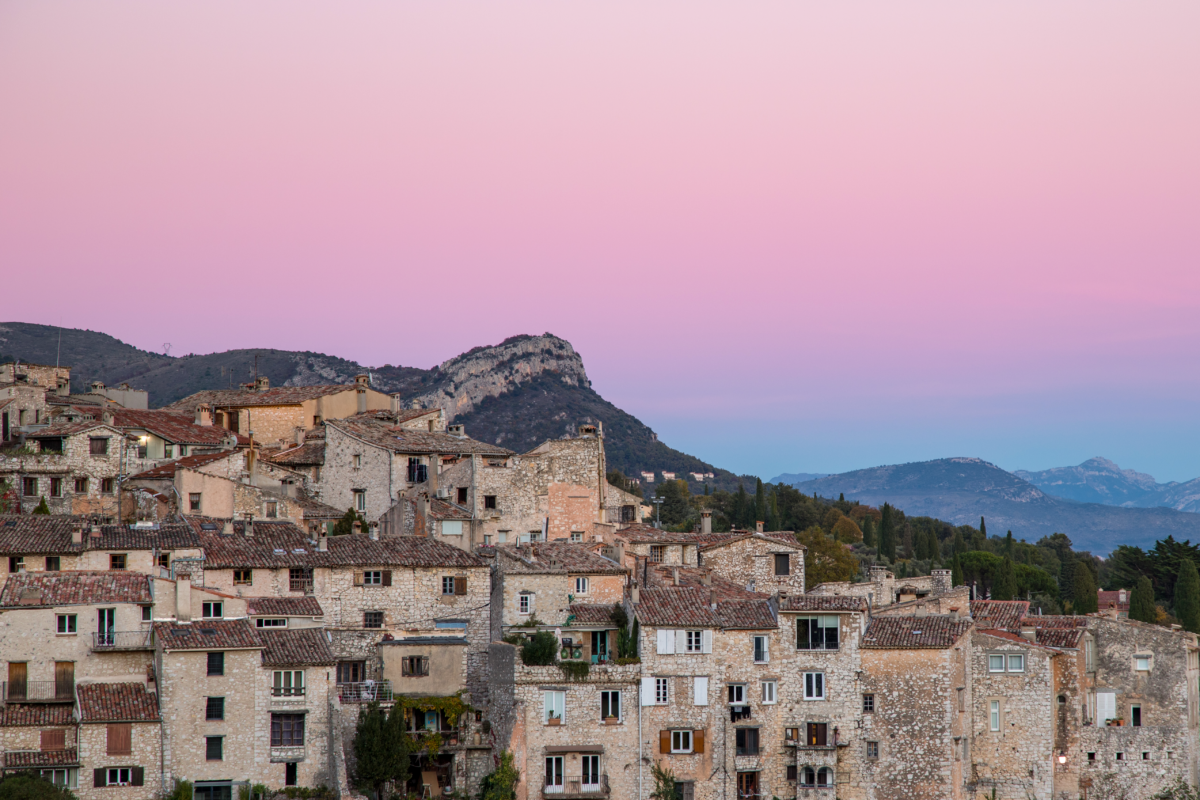 Sous un ciel pastel teinté de rose et de bleu, les façades de pierre s’illuminent des dernières lueurs du jour. Perché sur son éperon rocheux, le village révèle tout le charme de son architecture médiévale, blottie contre les montagnes du Moyen-Pays.