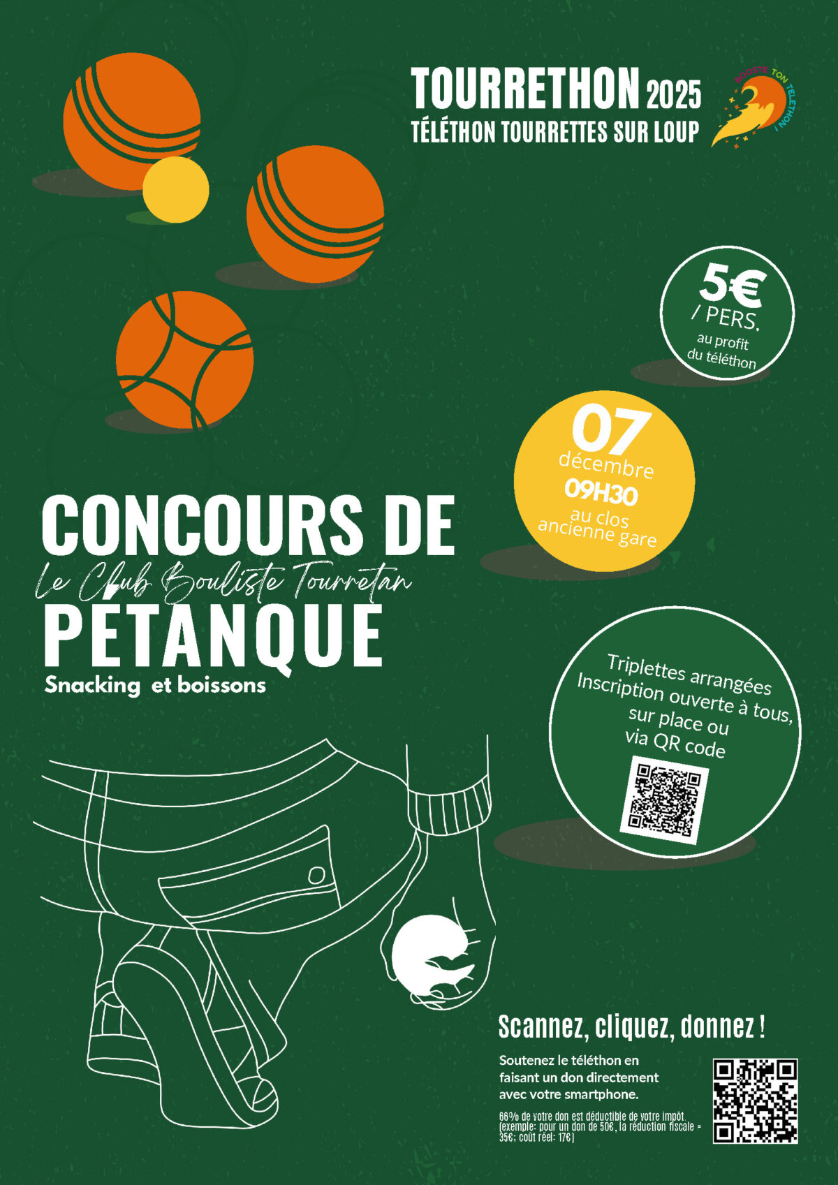 A l'occasion du Téléthon 2025, le Club Bouliste Tourrettan organise un concours de pétanque en triplettes arrangées, au clos des boules, à Tourrettes-sur-Loup. Le concours se tiendra dimanche 7 décembre à partir de 9h30.