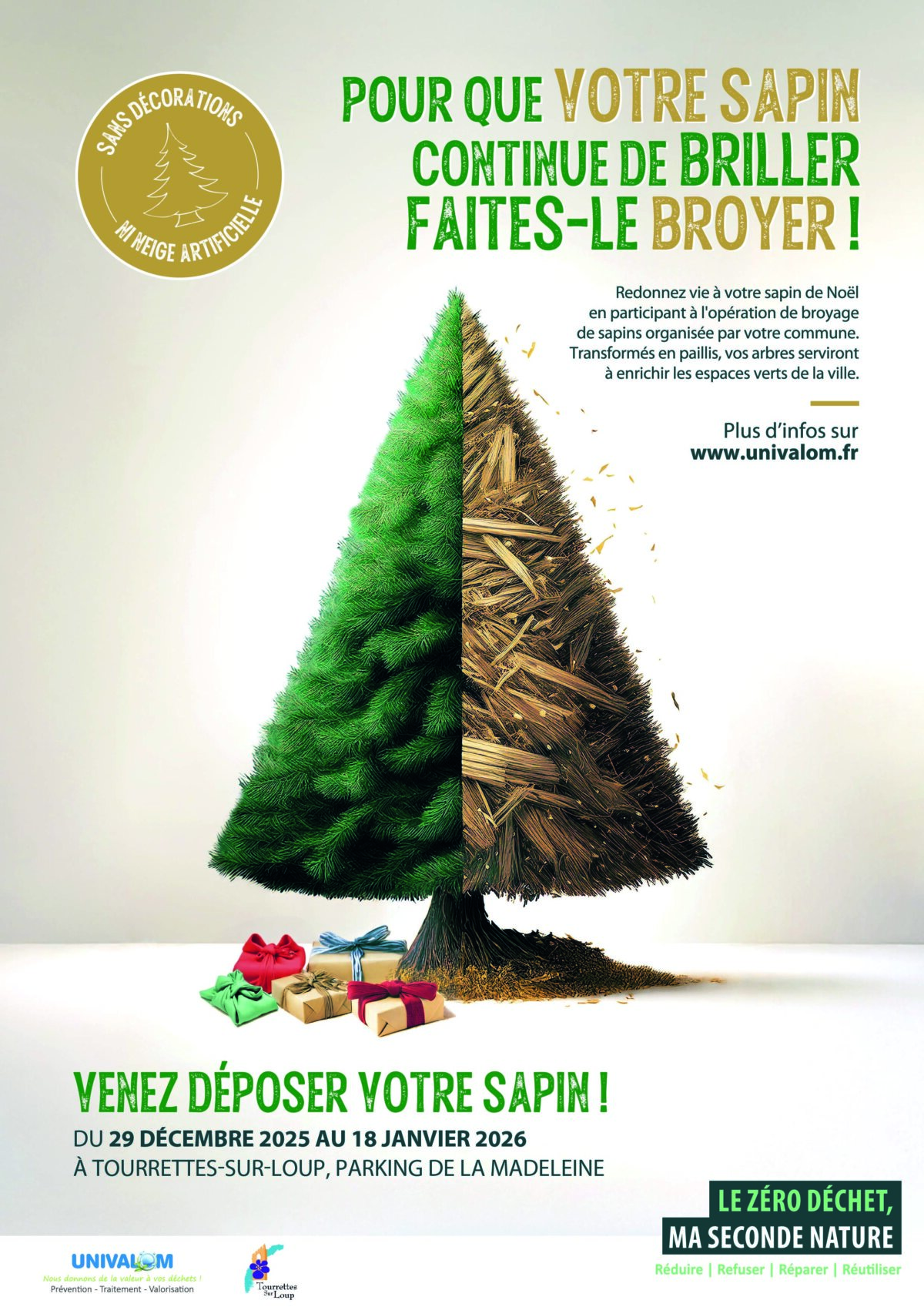 Après les fêtes, la Communauté d'Agglomération Sophia Antipolis et Univalom organisent la collecte et le broyage des sapins dans le but de revaloriser les déchets verts !