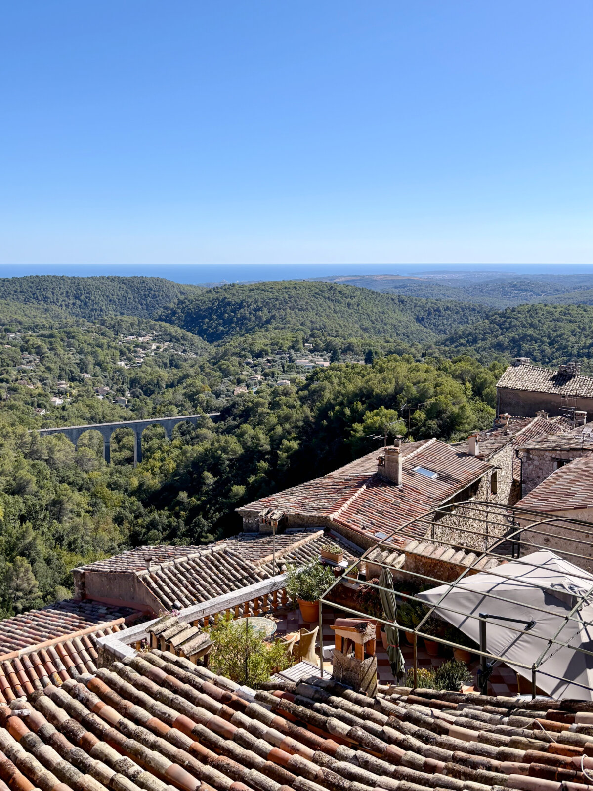 Cette semaine, nous vous présentons une photo prise depuis le centre ancien de Tourrettes-sur-Loup, offrant une vue sur les toits du village, le viaduc du Cassan, la bande littorale et, en ligne d’horizon, le bleu de la Méditerranée.