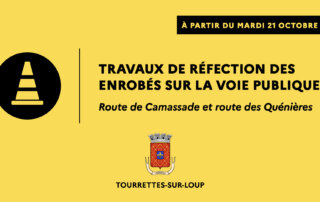 À partir du 21 octobre et durant plusieurs jours, des travaux de réfection d’enrobé auront lieu sur la route de la Camassade et la route des Quénières. Ces interventions entraîneront des perturbations temporaires de circulation…