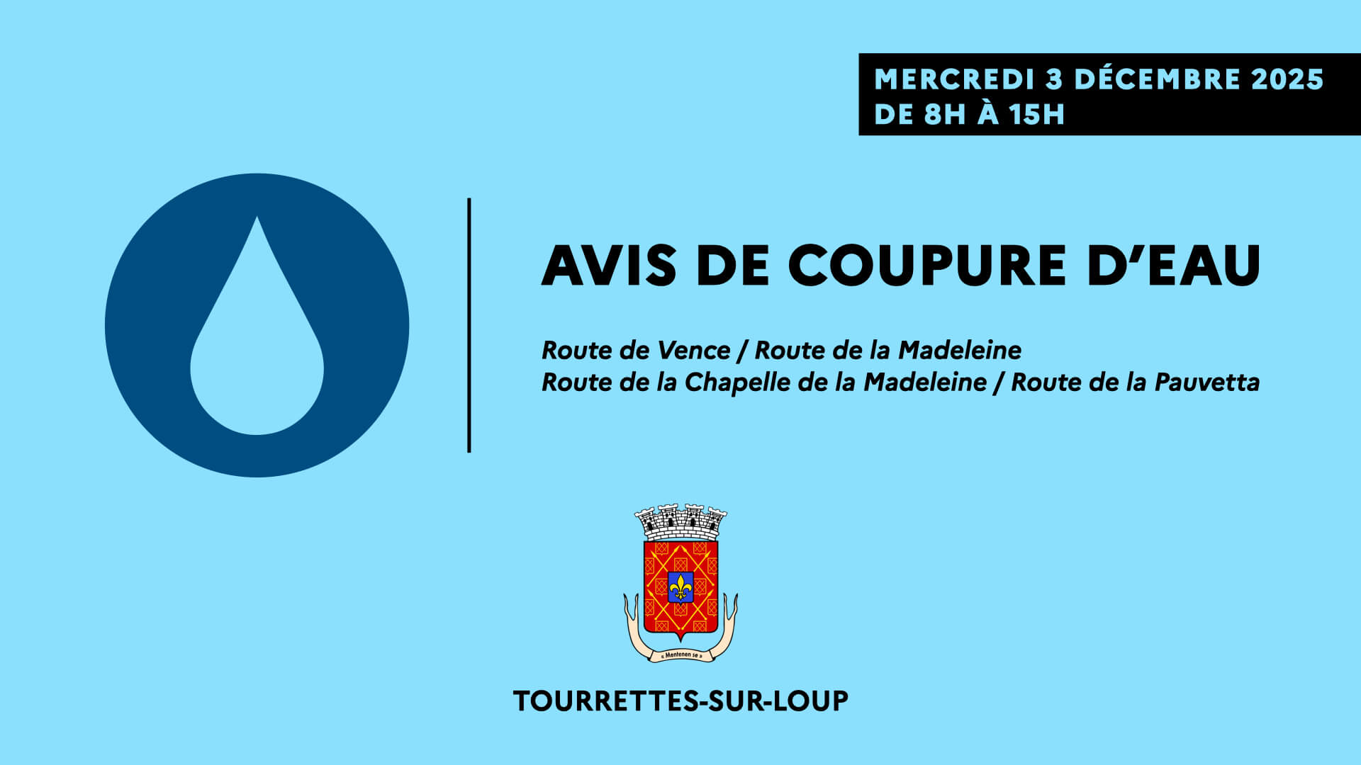 Suez, le gestionnaire du réseau d’eau potable à Tourrettes-sur-Loup, procédera à une intervention technique ce mercredi 3 décembre 2025, entre 8h et 15h. Ces travaux entraîneront une coupure d’eau de 2 heures sur une partie de la commune.