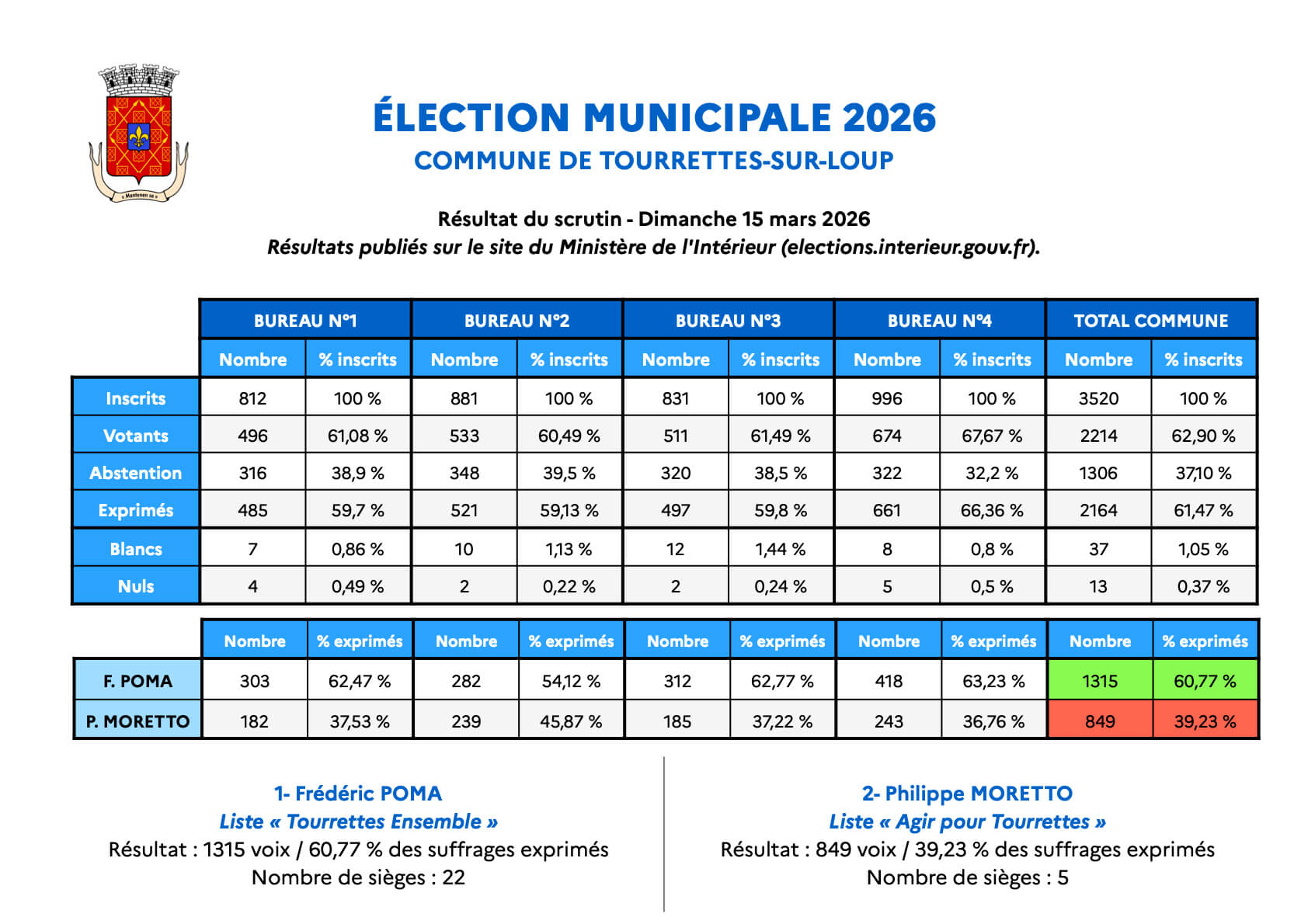 Les élections municipales se sont tenues le dimanche 15 mars 2026 à Tourrettes-sur-Loup, avec deux listes en présence.